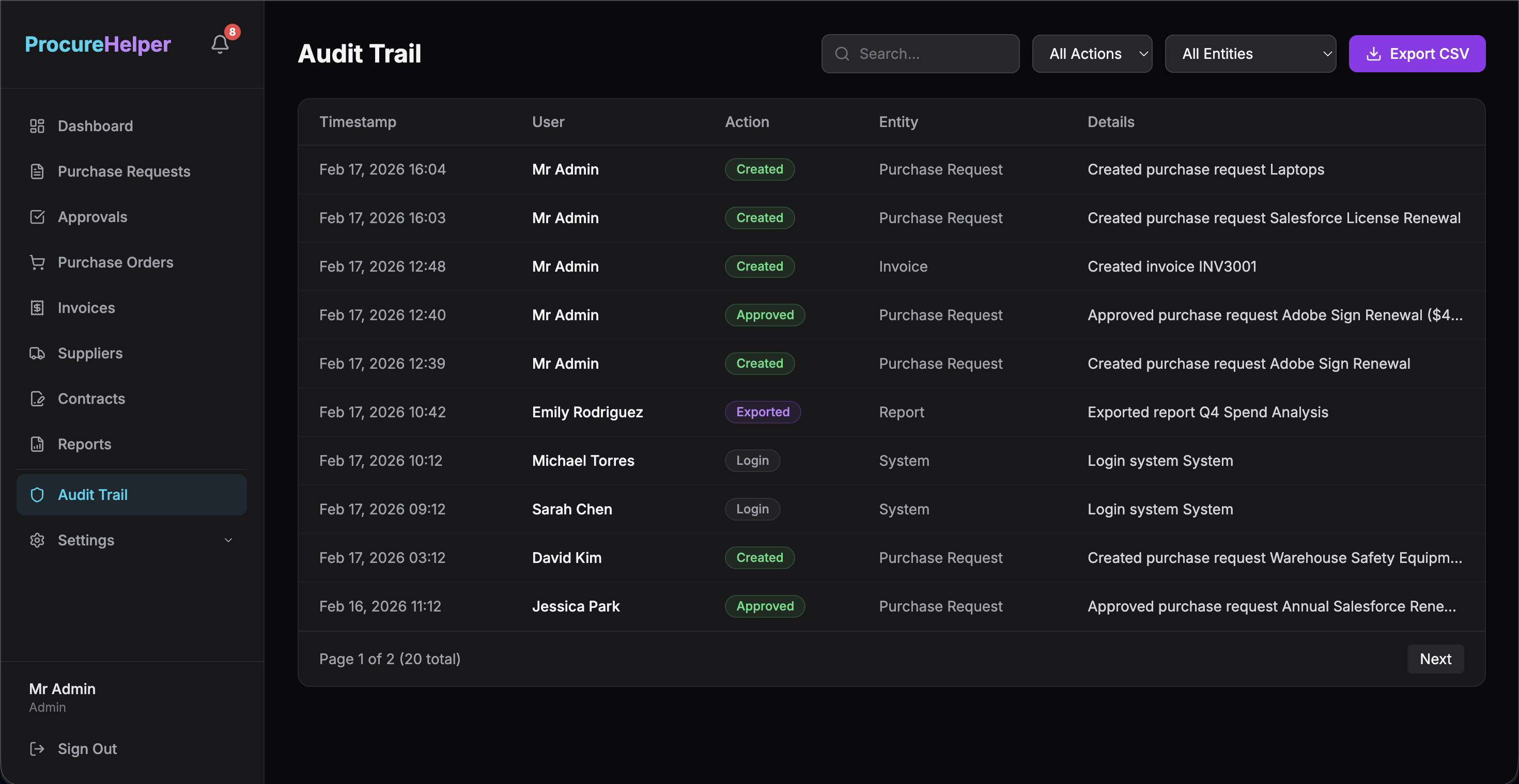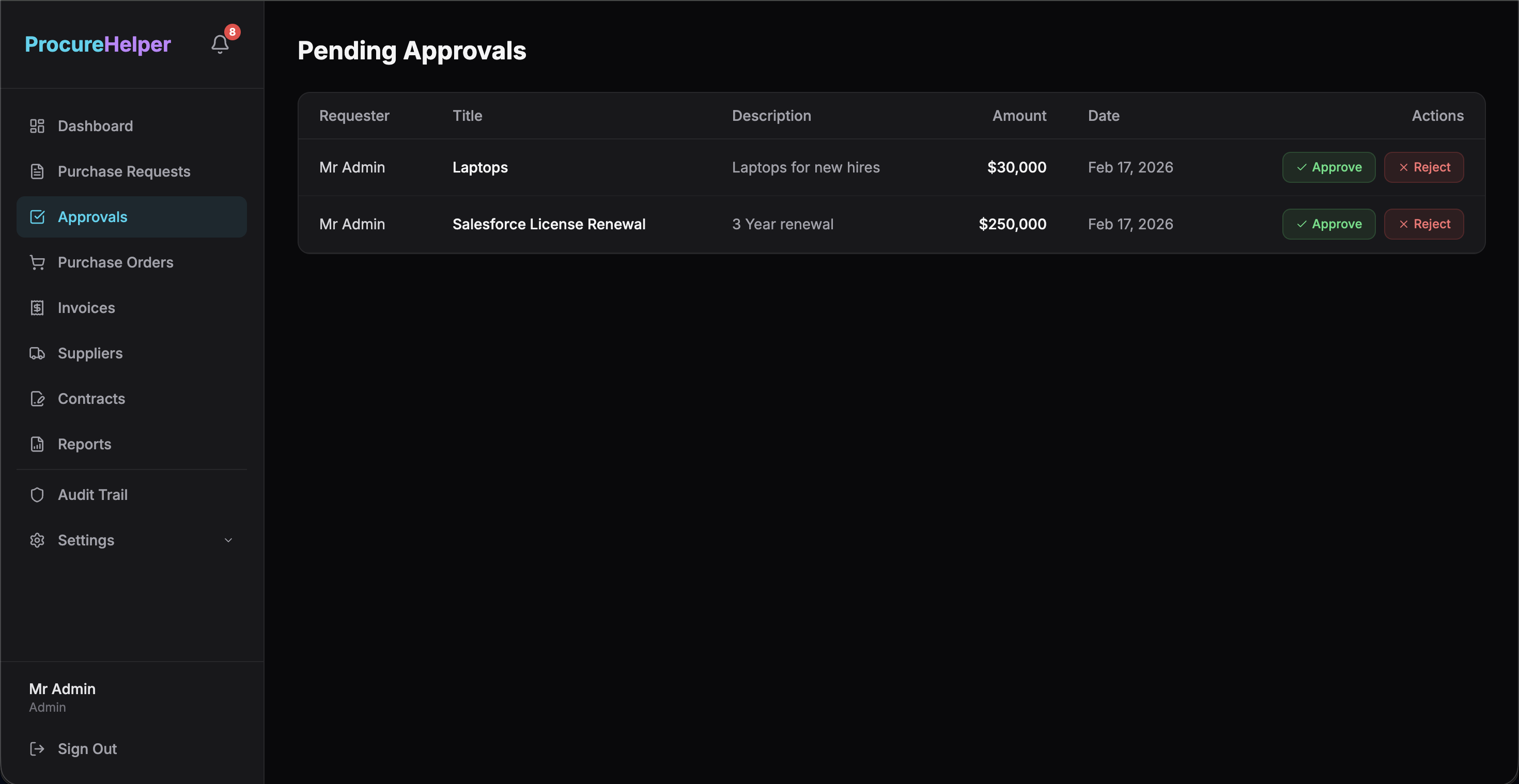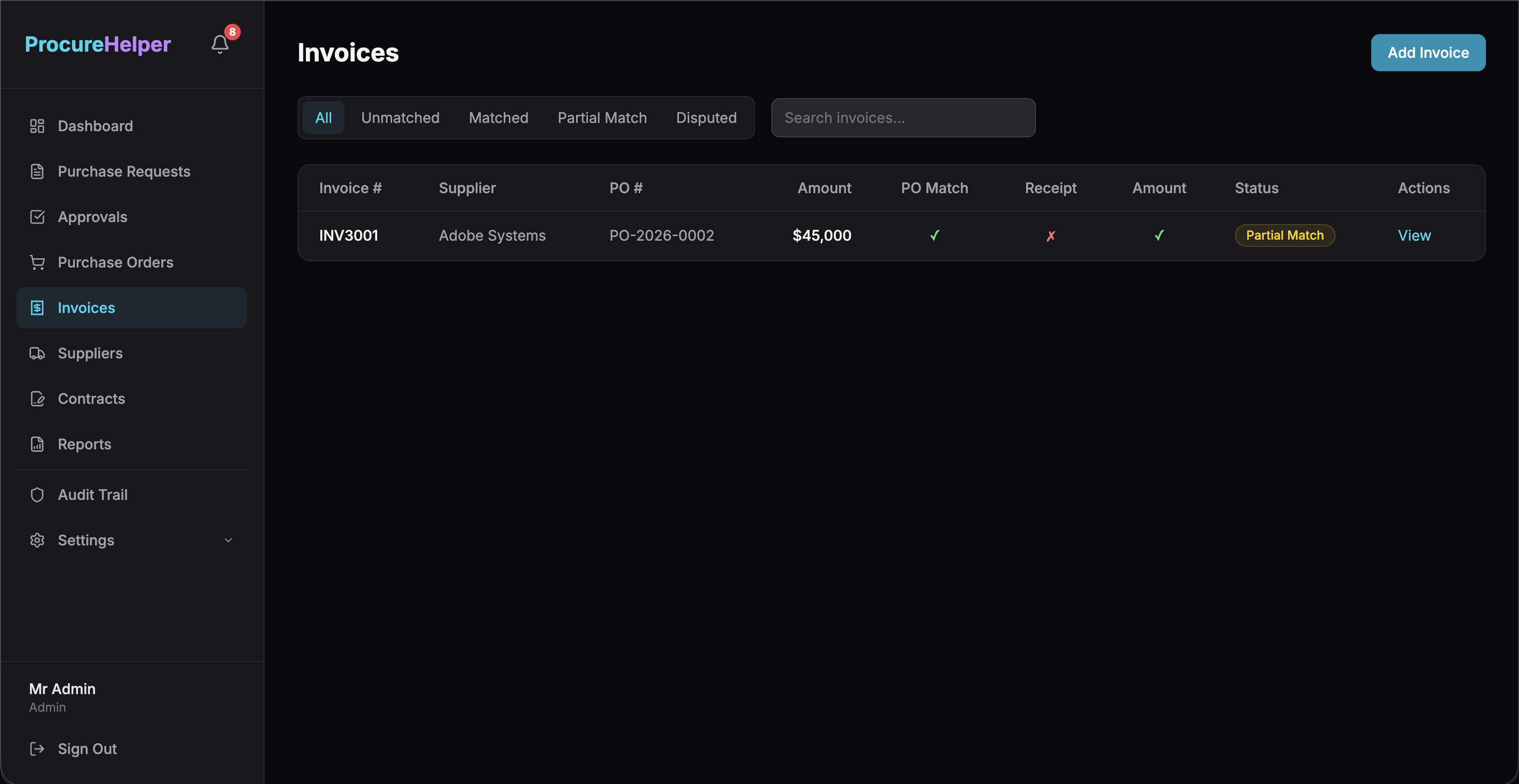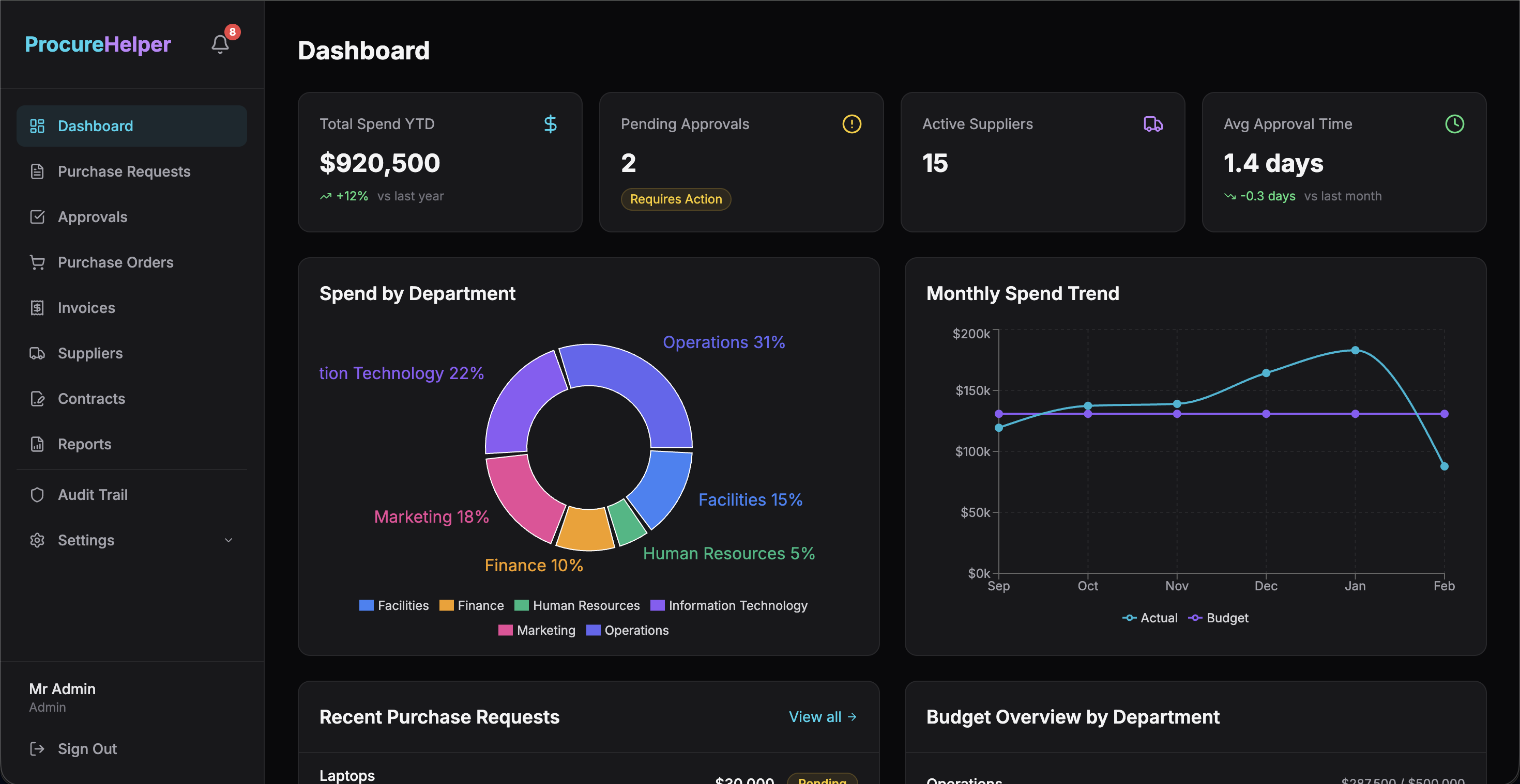 ProcureHelper deploys a configured procurement platform in as little as 2 weeks. Structured approval workflows, automated POs, 3-way invoice matching, and a full audit trail built around how your team actually operates.
